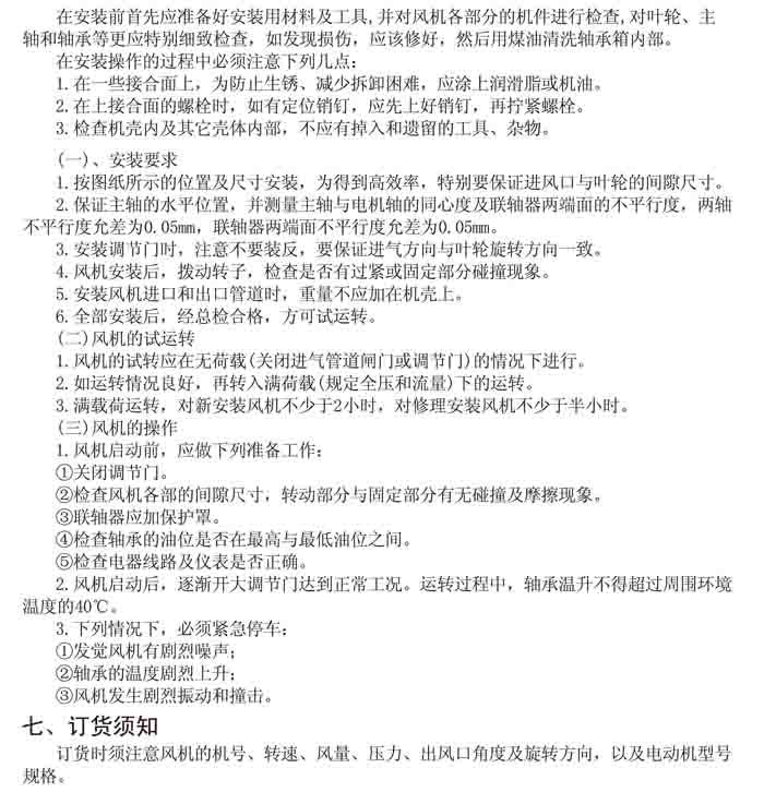 一、风机选用参考、安装维护使用说明、常见故障分析、订货注意事项