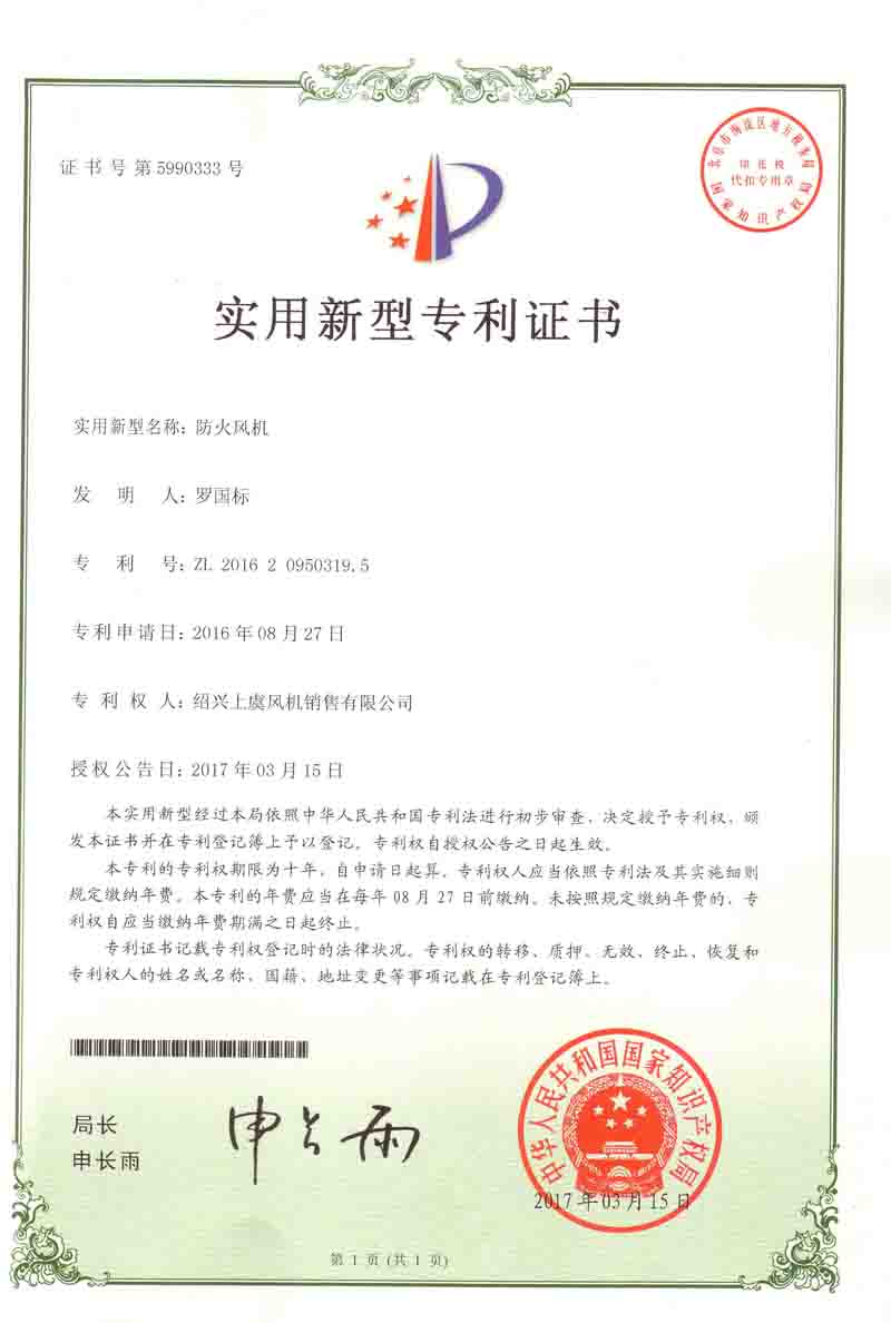 防火风机专利证书