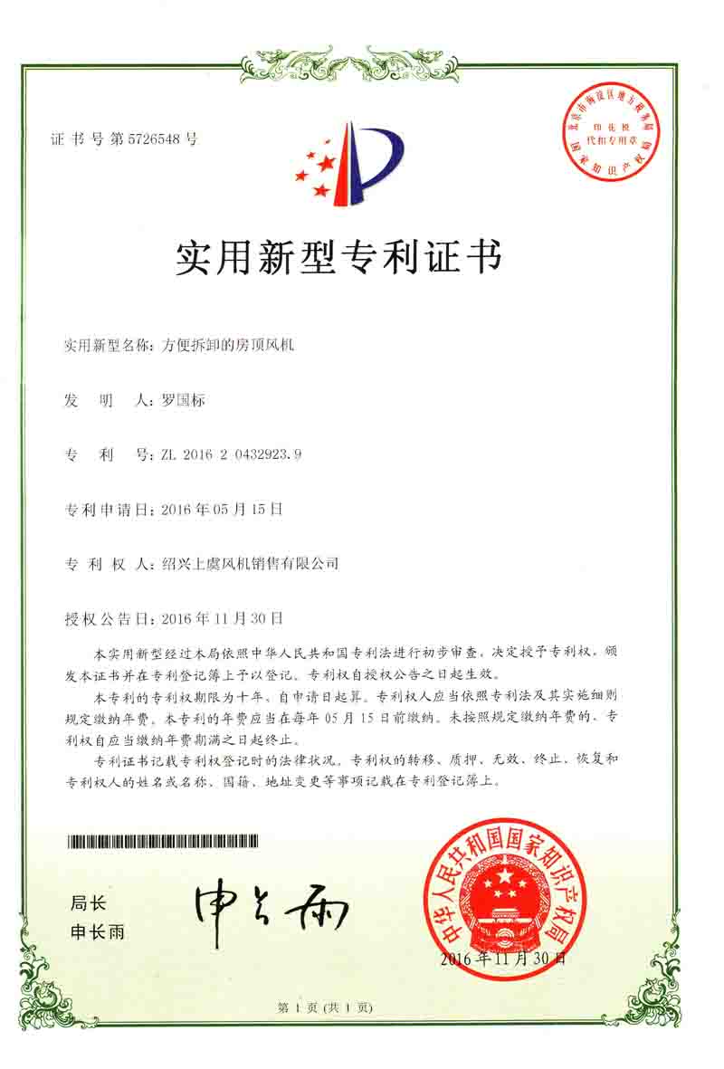 方便拆卸的房顶风机专利证书