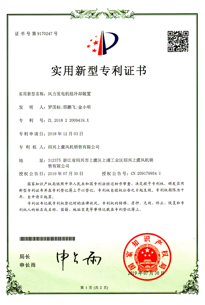 风力发电机足冷却装置专利证书